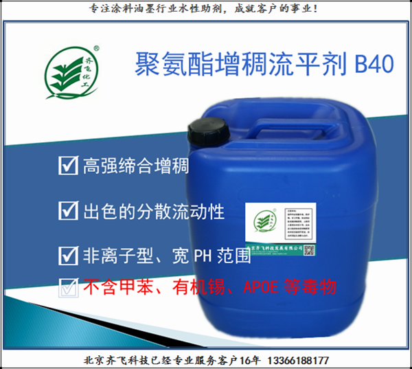 B40是一种非离子疏水改性聚氨酯流变增稠剂,兼顾增稠流平性能,水分散性能好。特别适用于乳胶漆、水性粘合剂、纺织涂料、水性油墨、水性涂料、皮革涂料等体系的增稠,具有杰出的增稠效果以及优异的流动性。